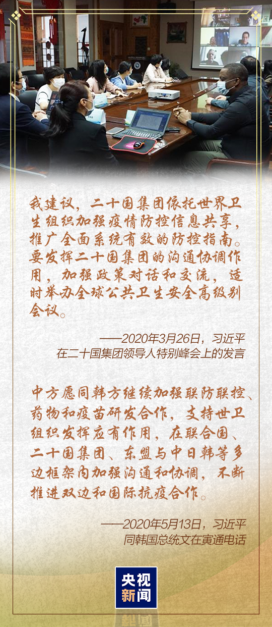 G20特別峰會上的發(fā)言《攜手抗疫 共克時艱》,第73屆世界衛(wèi)生大會視頻會議開幕式上的致辭《團結(jié)合作戰(zhàn)勝疫情 共同構(gòu)建人類衛(wèi)生健康共同體》,中非團結(jié)抗疫特別峰會上的主旨講話《團結(jié)抗疫 共克時艱》,縱觀習(xí)近平主席三次國際會議的講話,團結(jié)攜手之意貫穿始終。